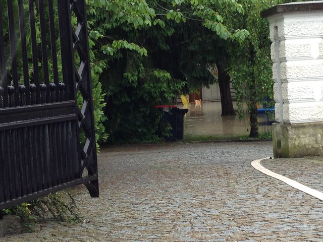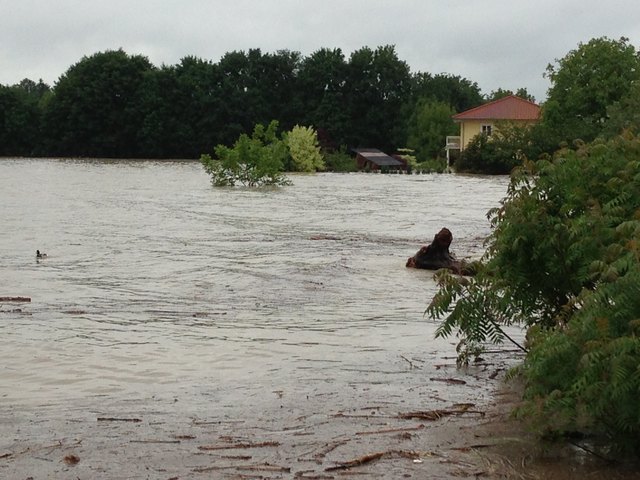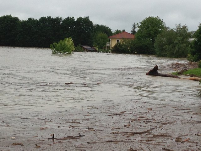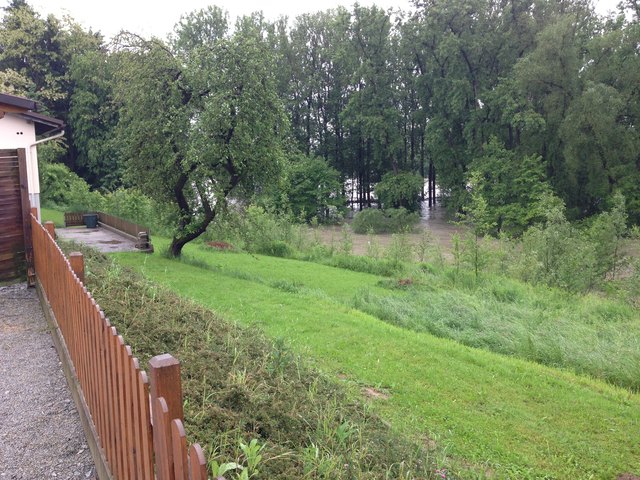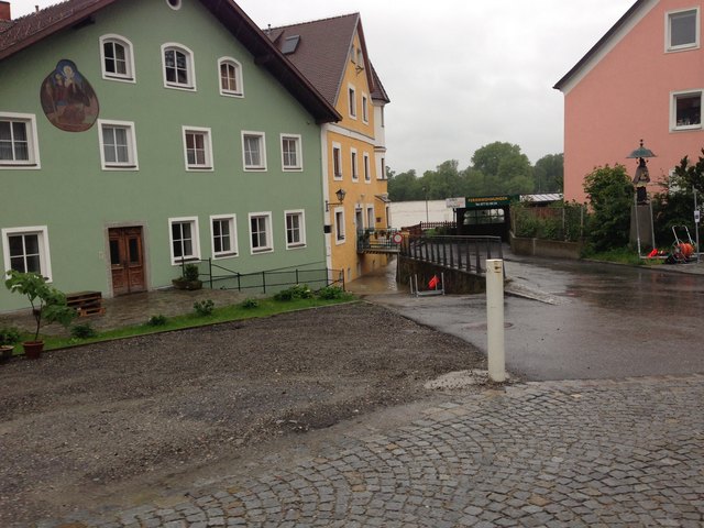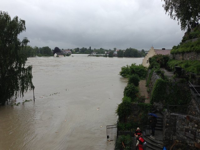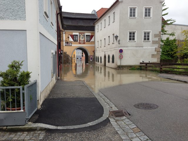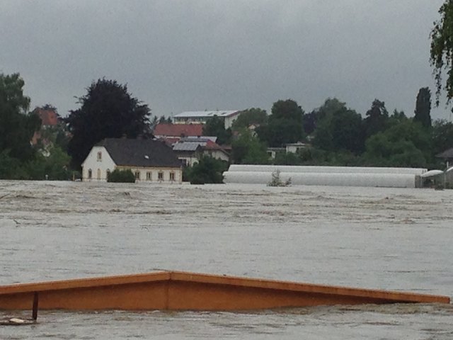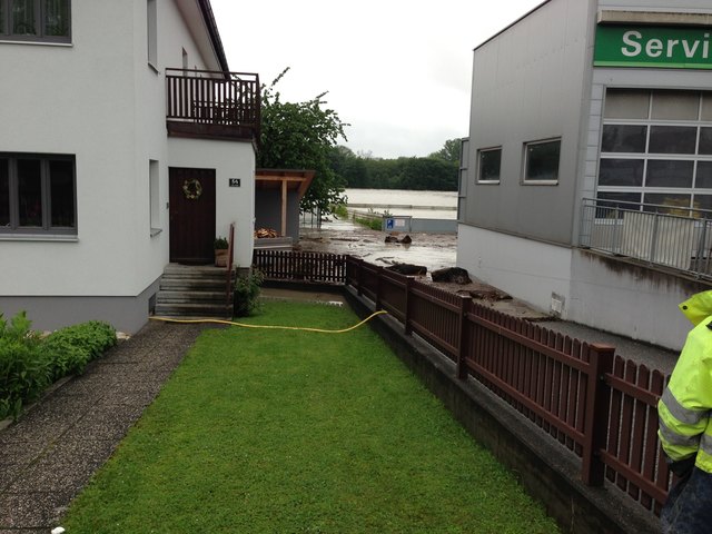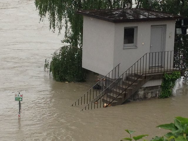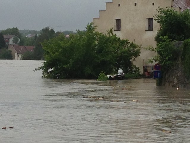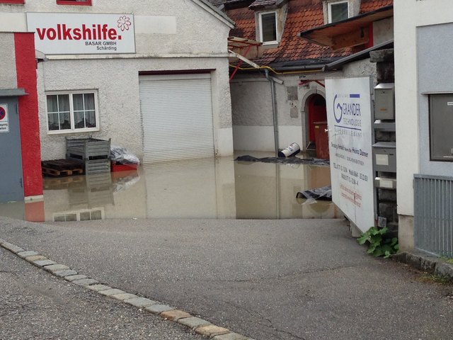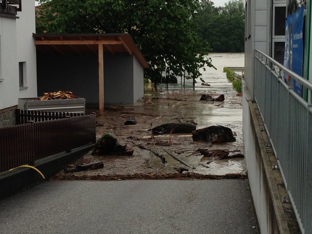 Unvorstellbare Not in Schärding. Über Nacht stieg der Inn auf 10,30m an und es ist noch immer kein Ende in Sicht. Die Bevölkerung ist ratlos. In der Linzerstraße vor einem Haus sagte ein Anrainer:" ich kann nur noch zuschaun" und schüttelte den Kopf. Das Wasser in seinem Keller steigt und steigt. Gartenhäuser, Autoreifen, Müll, Holz und diverse Sachen treiben durch die Vorstadtgärten die der Inn bereits eingenommen hat.