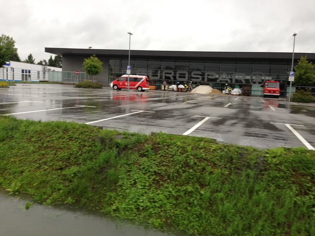 Am Eurosparparkplatz füllt die Feuerwehr Sandsäcke. Zahlreiche Firmen entlang der Linzerstraße räumen Ihre Lager und bringen Firmenautos in Sicherheit.