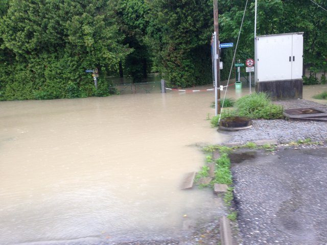 Auch in der Innbruckstraße und der Wieningerstraße herrscht Hektik. Wasser drückt aus Kellerfenstern und Ritzen auf die Straße.