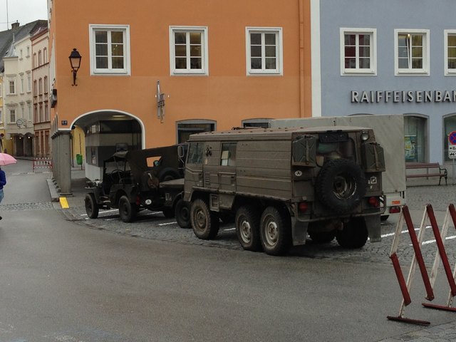 Am Stadtplatz ist bereits das Bundesher mit ihren Fahrzeugen vor Ort. Feuerwehr und Freiwillige arbeiten unermüdlich gegen die fluten an.