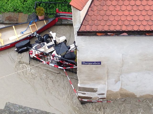 Die Wasserrettung sucht nach Menschen, die aus ihren Häusern nicht mehr wegkommen, ein Kamerateam des ORF streift durch die Gassen in Schärding. Unzählige Presseleute tummeln sich vor der überfluteten Kulisse.