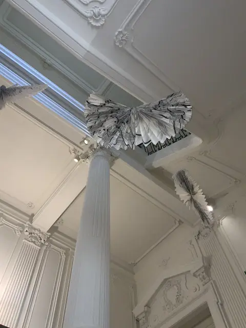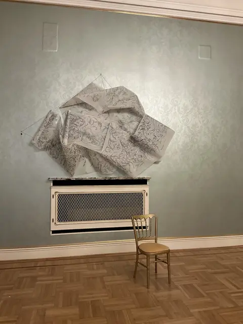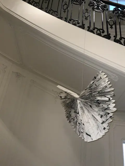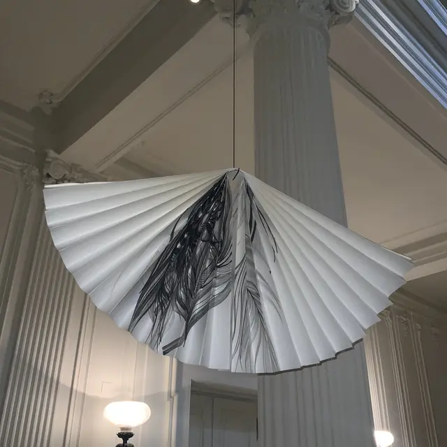 Papierobjekte erobern das Stiegenhaus und einen Salon und schaffen eine Symbiose aus filigraner Linienführung und architektonischer Prunk. Die Installationen werden zu einem visuellen Echo, das die historische Substanz des Ortes aufgreift und in eine neue, poetische Form übersetzt.