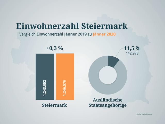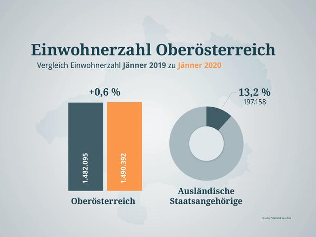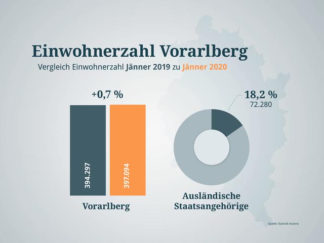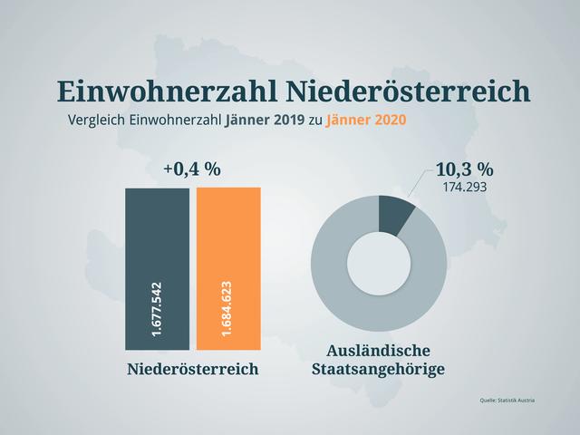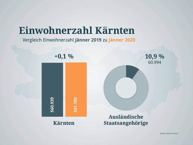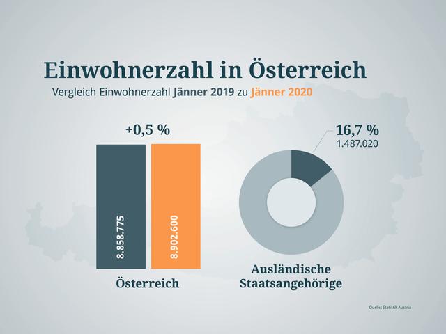 Laut vorläufigen Ergebnissen lebten am 1. Jänner 2020 8,902.600 Millionen Menschen in Österreich. Das entspricht einer Zunahme von 0,5 Prozent oder 43.825 Personen im Vergleich zum Jahresbeginn 2019. Im Jahr 2018 wuchs Österreich nur um 0,4 Prozent. In allen Bundesländern konnte ein Anstieg verzeichnet werden, der geringste Zuwachs ist in Kärnten.