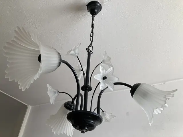3-armig, hübsche Hängelampe, schwarze "Arme" mit weißen Blüten (3 großen Blüten mit Leuchtkörper, 6 kleine Blüten als Dekor). Passend z.B. für Jugendzimmer, Vorraum, Essbereich etc.