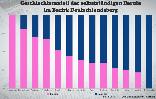Deutschlandsberg hat die wenigsten männlichen Psychotherapeuten in der Steiermark, dafür den höchsten Anteil an Frauen (13 von 16). Einen höheren Frauen- als Männeranteil weisen sonst noch die Apotheker (70 %), Psychologen (67 %), Gewerbetreibenden (52 %) und eben Hebammen auf – in der ganzen Steiermark gibt es keine männliche Hebamme. Umgekehrt findet sich unter den acht Deutschlandsberger Ziviltechnikern keine einzige Frau.