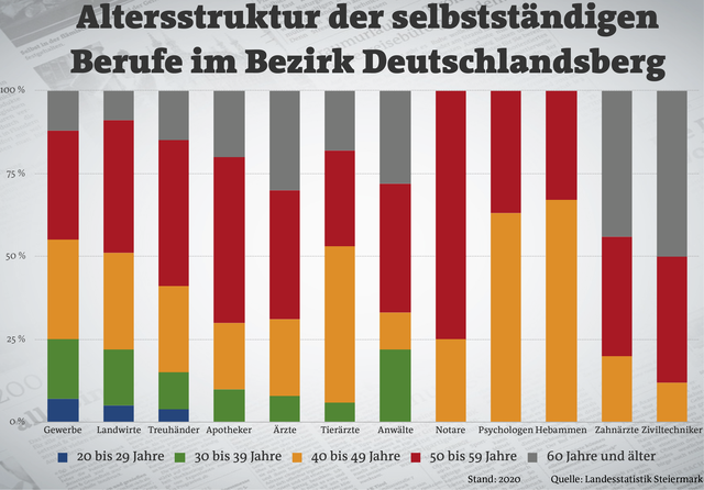 Alarmierend ist aber die Altersstruktur in einigen Berufsgruppen. Der Anteil der Personen über 40 Jahren nimmt immer mehr zu, bei den Ziviltechnikern und Zahnärzten ist die Mehrheit schon über 60 Jahre alt. Nicht ganz so kritisch ist es bei den Ärzten, die oft mit Sorge betrachtet werden: Hier gibt es im Bezirk Deutschlandsberg schon mehr Personen zwischen 30 und 49 als über 60-Jährige.