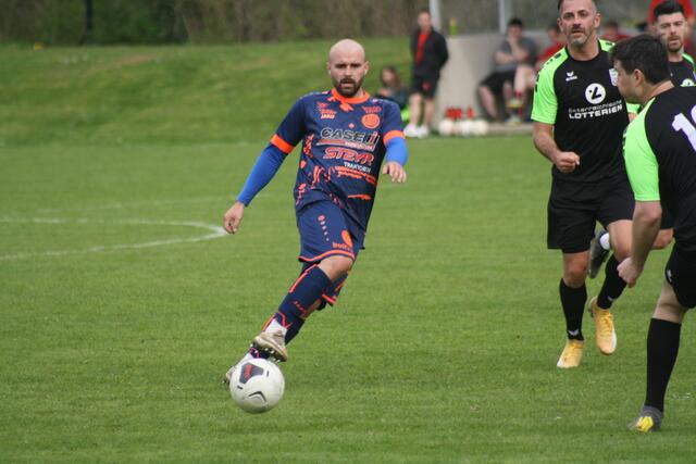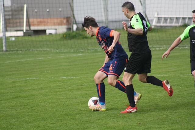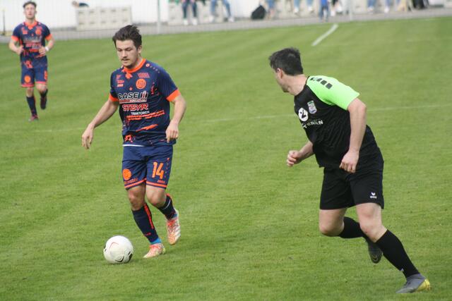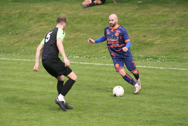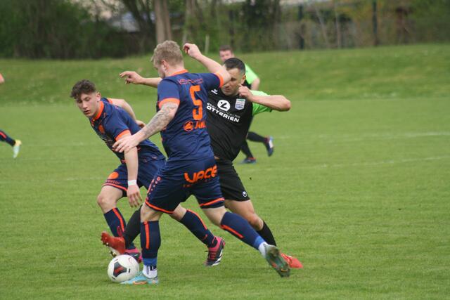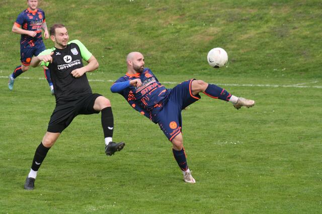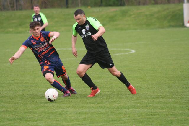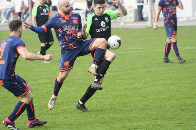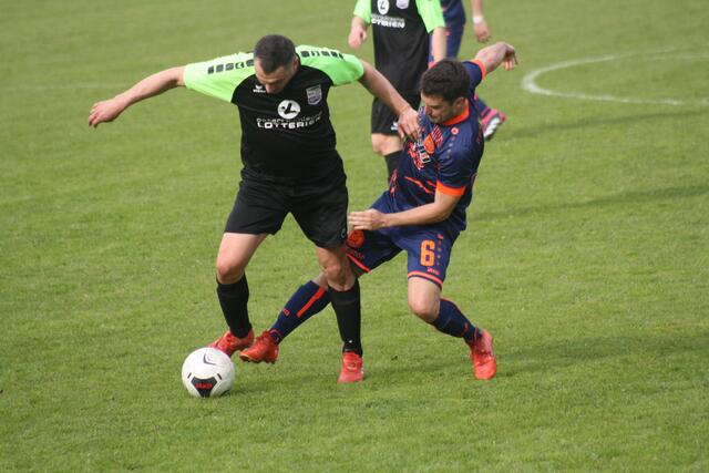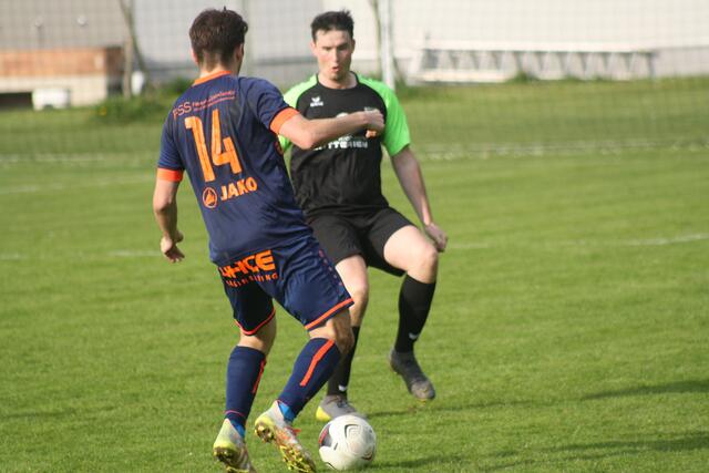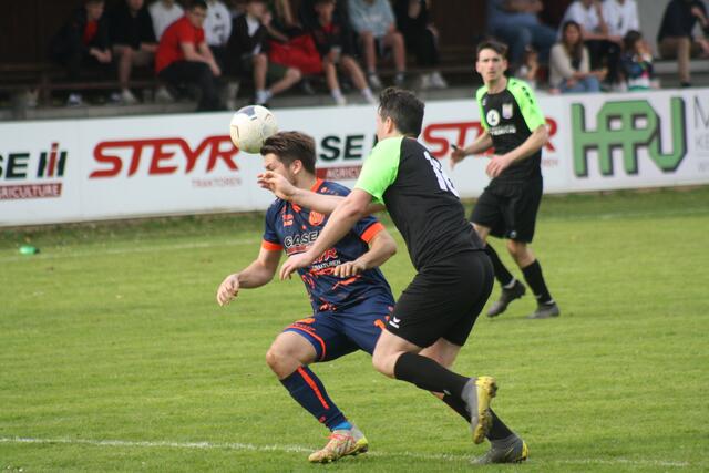 - ASK-Spielertrainer Christoph Guselbauer (l.) kam einem Treffer im Duell mit der SPG Langenstein/St. Georgen noch am Nächsten. Sein Kopfball in Minute 53 landete aber an der Querlatte.
