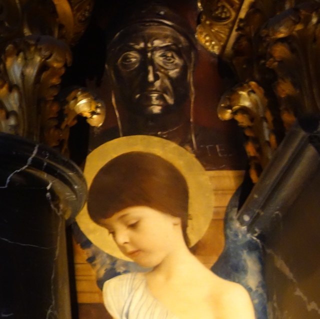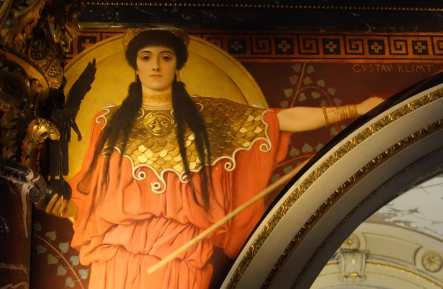 Klimtbrücke im Stiegenhaus des Kunsthistorischen Museums; da kann man in fast 12 m Höhe den sonst kaum sichtbaren Klimt-Bildern bzw. den dort dargestellten Symbolgestalten für verschiedene Kunstepochen ins wunderschöne Gesicht schauen.
