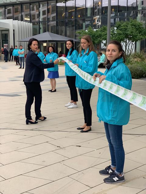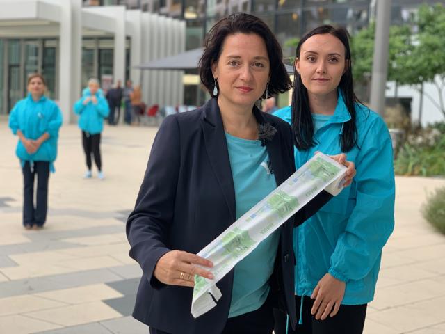 - Klopapier-Geldscheine in Höhe von 95.000 Euro wurden von Gudrun Kugler (ÖVP) und ihrem Team vor dem KH Nord aneinandergereiht.