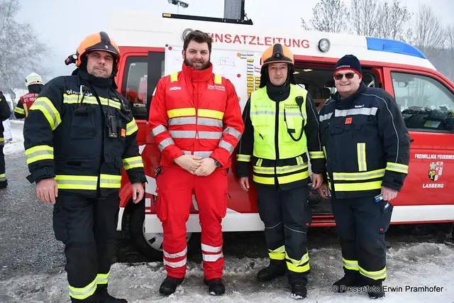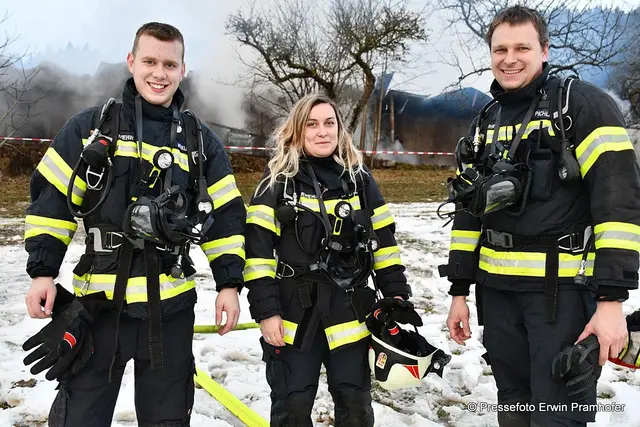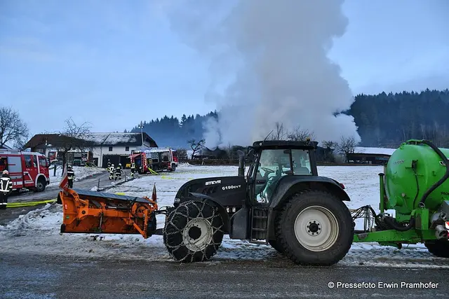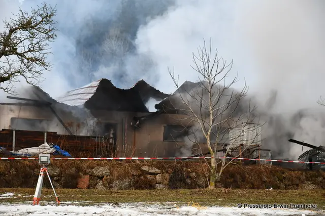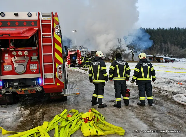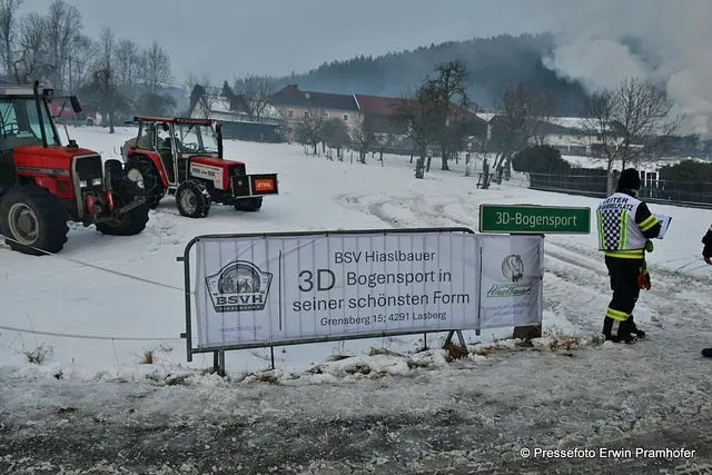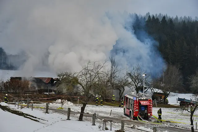 LASBERG. Bilder vom heutigen Großbrand in der Ortschaft Grensberg am Fuße des Braunbergs. Die Gerätehalle des „Hiaslbauern“ stand im Vollbrand. Elf Feuerwehren waren bei Alarmstufe 2 im Einsatz.