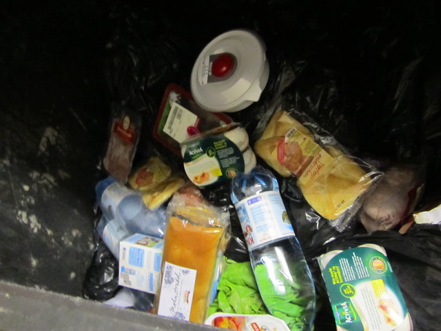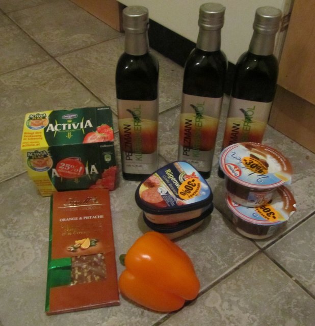 Wir haben dieses Mal Glück, es wurde ein ganzer Sack mit Lebensmitteln weggeworfen. Salat, Brot, Milchprodukte, Paprika, Schokolade, Aufstriche und sogar 3 Flaschen Kürbiskernöl finden wir in der Tonne. Anscheinend ist eine Flasche kaputt geworden und anstatt die öligen, aber intakten Flaschen abzuwaschen, wurden alle einfach weggeworfen.