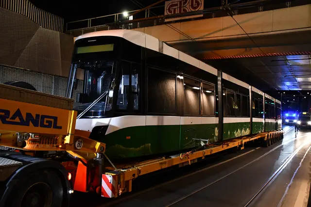 "Guat is gangen, nix is gschehn": Spektakulär waren der Transport und die Einfahrt der ersten neuen Straßenbahn in Graz mitten in der Nacht. Die erste Graz Flexity des Herstellers Alstom kam um 3.20 Uhr per Tieflader von der Bundeshauptstadt nach Graz. Ab kommendem Frühjahr soll sie im Personenverkehr unterwegs sein.