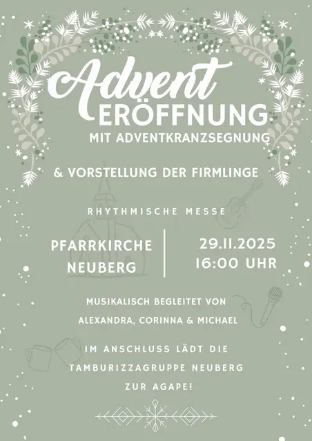 Traditionell wird der Neuberger Advent am Samstag, vor dem 1. Adventsonntag eröffnet. In diesem Jahr findet die Adventeröffnung am 29.11.2025 statt. Um 16.00 Uhr findet in der Pfarrkirche eine rhythmische Messe statt, die von Alexandra Kulovits, Corinna Poglitsch und Michael Neubauer musikalisch gestaltet wird. Im Rahmen der Messe findet auch die Adventkranzsegnung und die Vorstellung der Firmlinge statt. Im Anschluss an die kirchliche Feier lädt die Tamburizzagruppe Neuberg zur Agape vor der Kirche ein.
