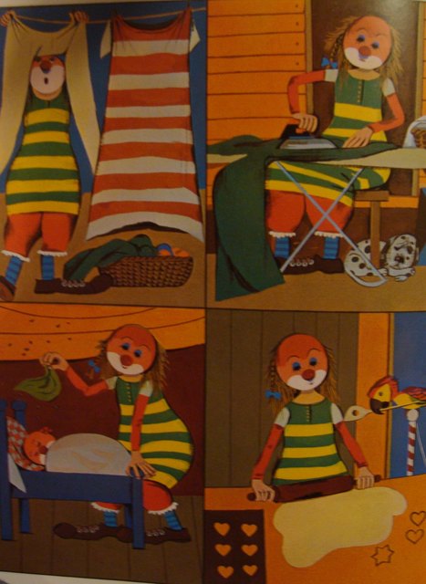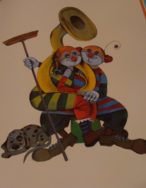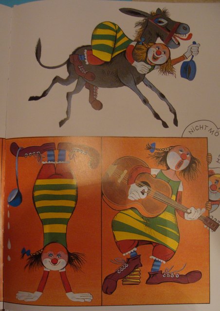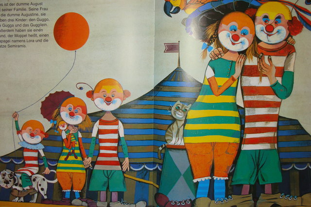 An diesem Abend saßen der dumme August und seine Frau noch lange Zeit vor dem Zirkuswagen. ... "Weißt du was, Augustine?", sagte der dumme August. "Von jetzt an wollen wir unsere Arbeit gemeinsam tun. Ich helfe dir in der Küche und bei den Kindern - und du trittst mit mir zusammen im Zirkus auf.