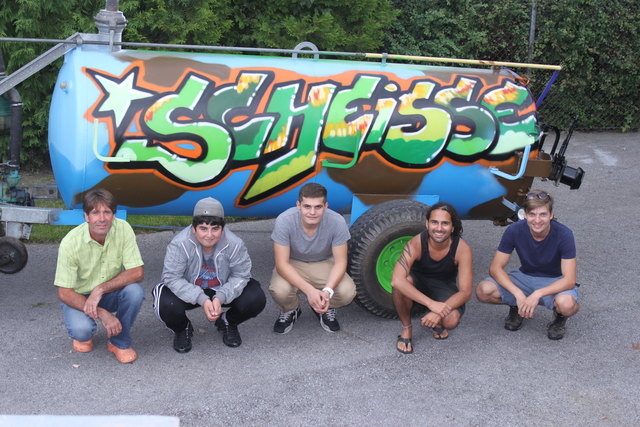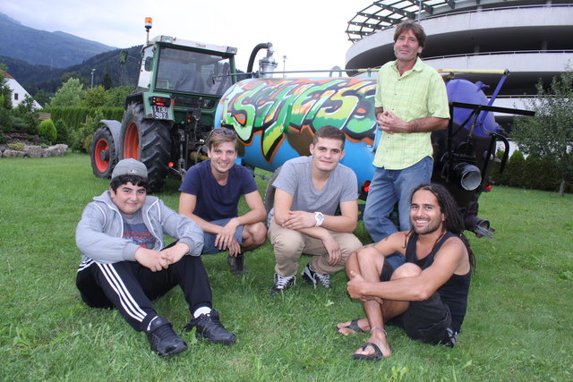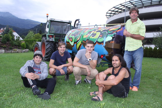 Schon vor zwei Jahren hatte Bauer Sepp die Idee, auf seinen Surwagen (Jauchewagen) den Schriftzug "Scheiße" sprayen zu lassen, doch er konnte niemanden finden, der diesen Auftrag annehmen wollte. "Ich habe dann im Stadtblatt den Artikel über den Graffiti-Workshop vom Z6 Streetwork bei einer Mauer im Beselepark gelesen. Da habe ich mich sofort beim Z6 gemeldet", so Bauer Sepp. Warum er gerade "Scheiße" auf seinem Wagen stehen haben will? "Das habe ich ja auch im Wagen drinnen, treffender kann man es nicht ausdrücken", lacht Sepp. Schauen würden die Leute schon, wenn er mit seinem Surwagen aufs Feld fahre. Bisher habe sich aber noch niemand getraut, ihn darauf anzusprechen. Besprüht wurde der Surwagen wieder in einem Z6 Workshop mit Sprüher Albi Donauer. Dieses Mal hatten drei Jugendlichen aus der Höttinger Au die Ehre zu den Spraydosen zu greifen. Michelle (15), Angelo (19) und Fabian (15) hatten damit drei Stunden lang Arbeit.