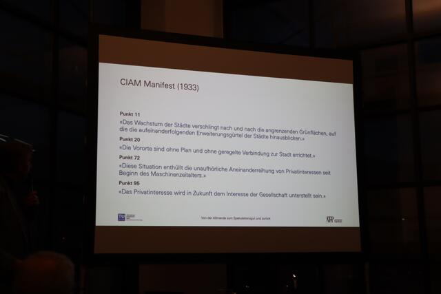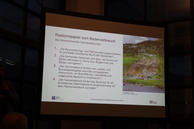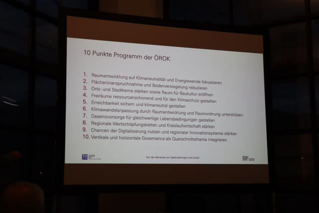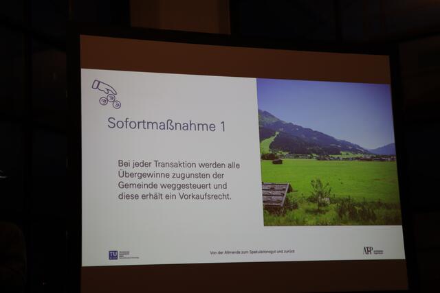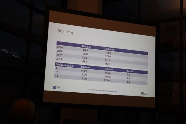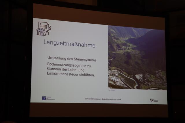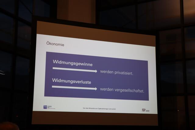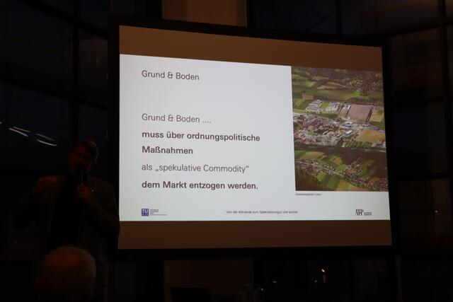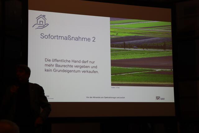 Zum Schluss des Vortrags meint er: "Mein Idealbild für das Land wäre ein Österreich, das den Gemeinden gehört." Die Gemeinden könnten dann über Bau- und Nutzungsrecht entscheiden, der Grund und Boden würde aber der Allgemeinheit gehören.