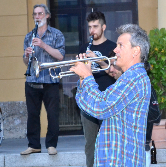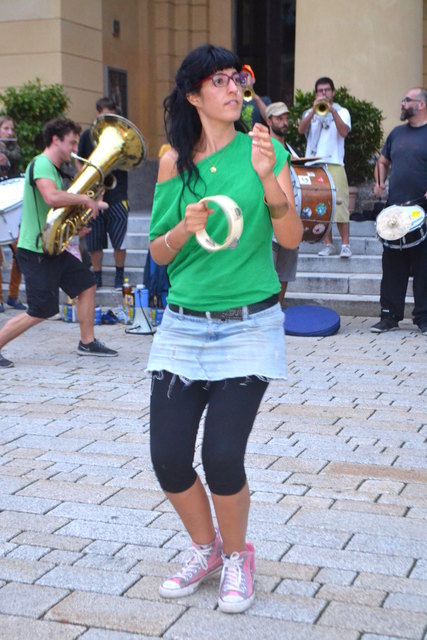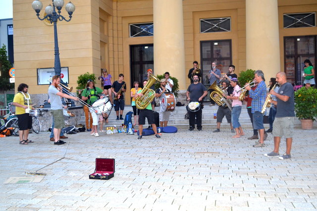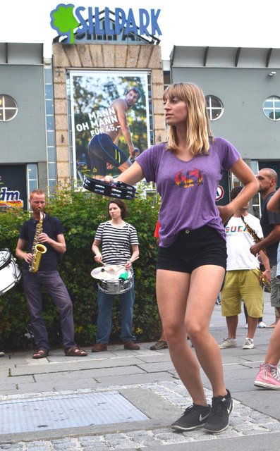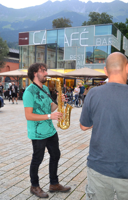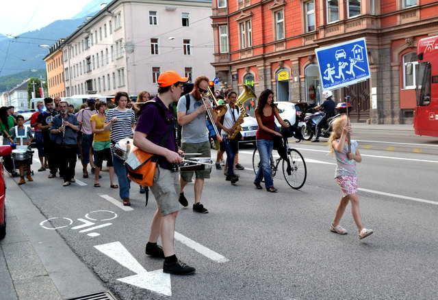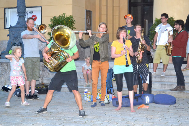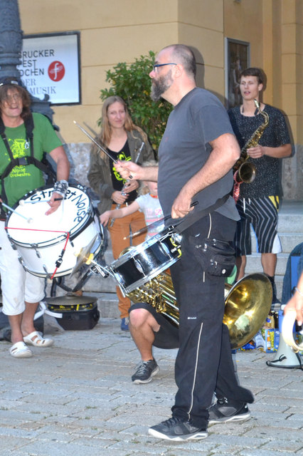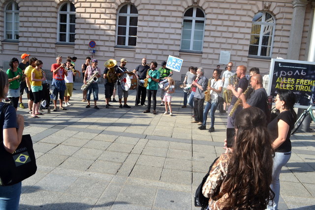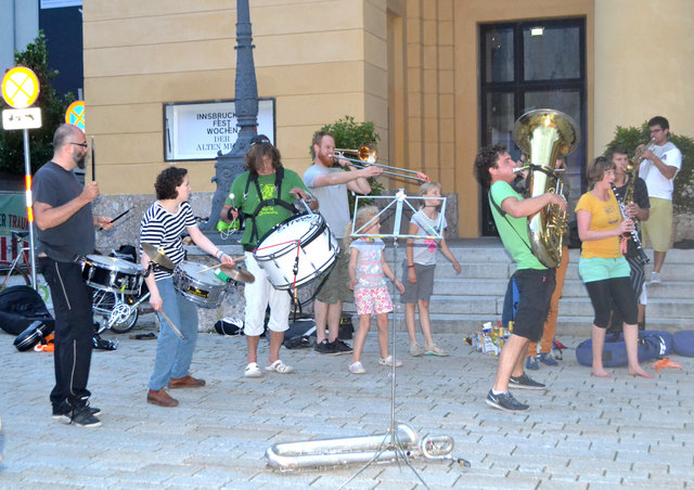 Ordnungsgemäß angekündigt, in Begleitung von einigen geduldigen PolizistInnen, die ganz offensichtlich auch ganz gerne zuhörten, zogen die StraßenmusikanInnen von der Annasäule, über den Platz vor dem Landesmuseum und die Museumsstraße bis zum Sillpark. An den drei Plätzen spielten sie lautstark und schwungvoll ihre Musik zum Vorbeigehen, Mitnehmen, Mittanzen, Mitgrooven, Hinhören, Zuschauen und Aufhorchen. Tatkräftig begleitet wurden sie dabei von der befreundeten Straßenmusik-Gruppe FIATI SPRECATI aus Florenz, die schon am Vortag zu Besuch gekommen waren.