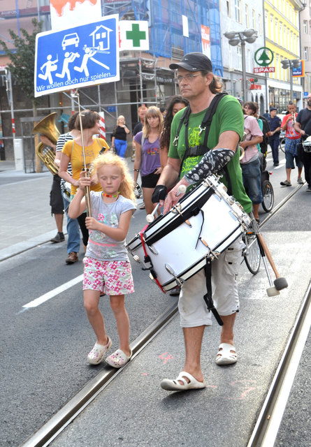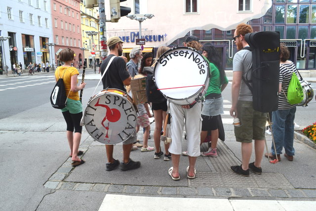 "Es geht uns darum, dass wir uns für eine liberalere Politik für Straßenmusiker einsetzen!", erklärte Christian Menges vom Streetnoise Orchestra. Die Gruppe besteht seit drei Jahren (2013) und trifft sich regelmäßig in einem Probenraum in der Jungen Talstation (alte Hungerburgtalstation). Heuer waren sie von einer befreundeten Gruppe schon zu einem zweitätigen Festival rund um den 1. Mai nach Paris eingeladen. Nach dem letzten Demonstrations-Stopp vor dem Sillpark, gingen die Musikanten quasi zur "Abschlusskundgebung" zum Landestheater. Dort wurden sie vom Veranstalter des Festivals der Träume zu einer Spielstunde vor der Vorstellung eingeladen.
