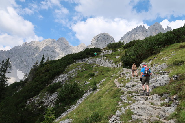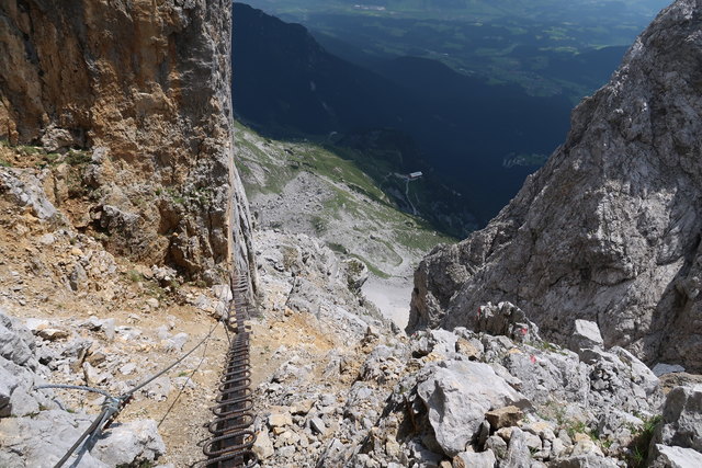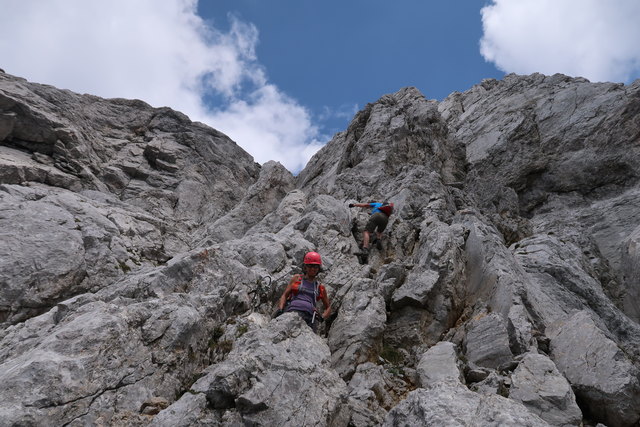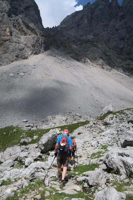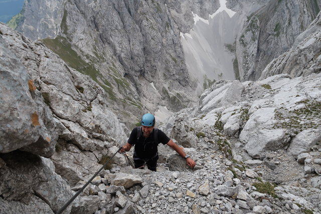 Auf dem folgenden Anstieg über den Gamsängersteig besteht große Gefahr durch Steinschlag, deshalb ist Vorsicht geboten, deshalb Kletterset anziehen und Helm aufsetzen.