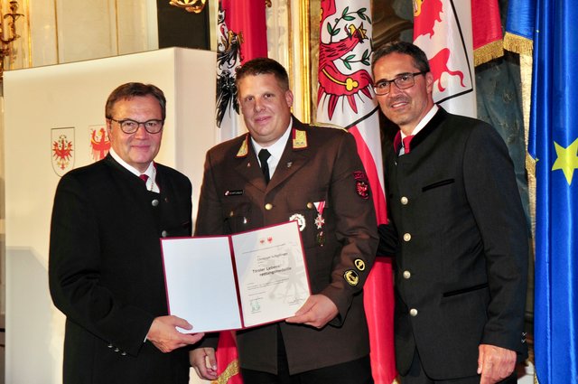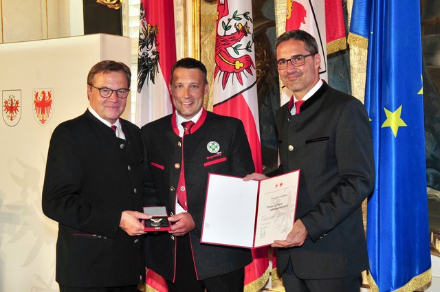 - Stellvertretend für andere Lebensretter: Richard Pali (St. Johann) mit LH Günther Platter und LH Arno Kompatscher.