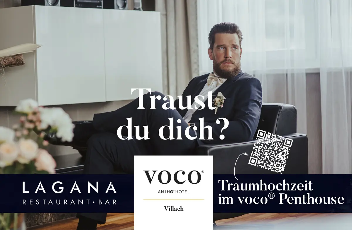 KÄRNTEN, VILLACH. Das 4-Sterne-Superior-Hotel voco® Villach befindet sich am Ufer der Drau und bietet den perfekten Ort, um „JA“ zu sagen. In den verschiedenen Räumlichkeiten kann entweder im kleinen Kreis als auch mit einem rauschenden Hochzeitsball die Liebe gefeiert werden. So kann die standesamtliche Trauung entweder auf der Terrasse des Penthouse, in der Galerie Draublick, im Drauraum mit Panoramablick oder in den verschiedenen Sälen abgehalten werden.