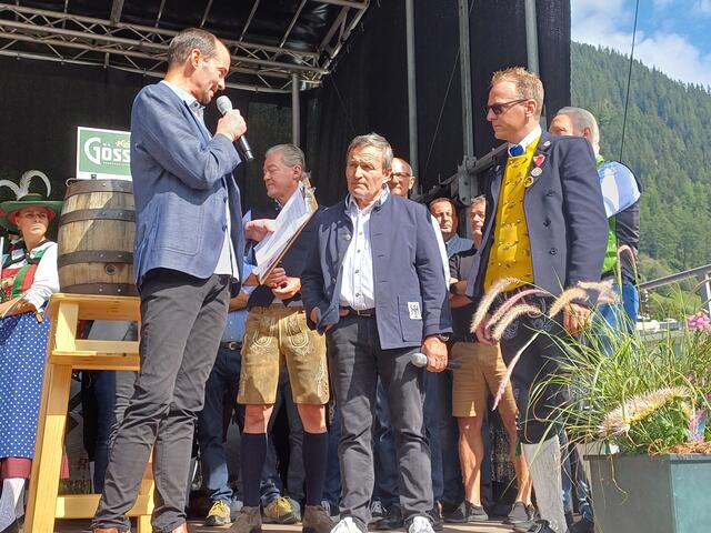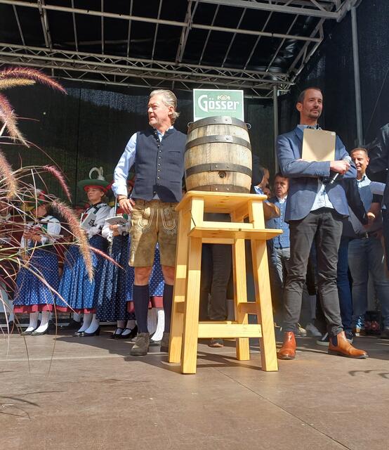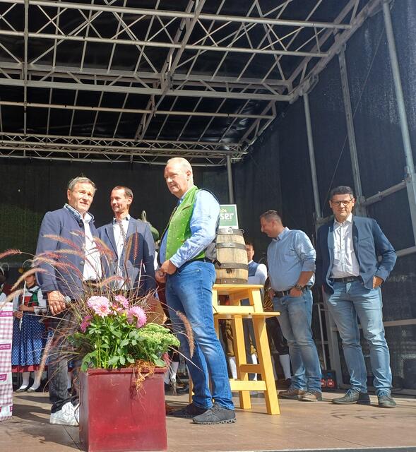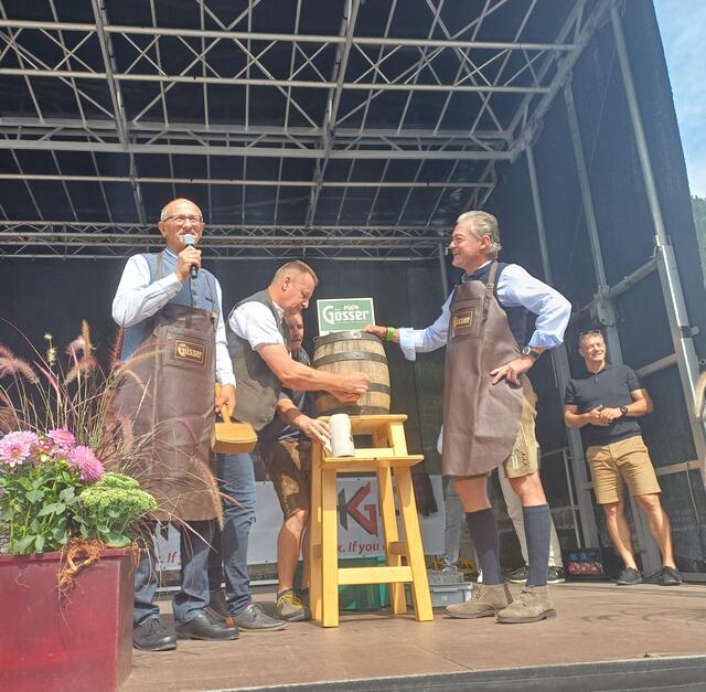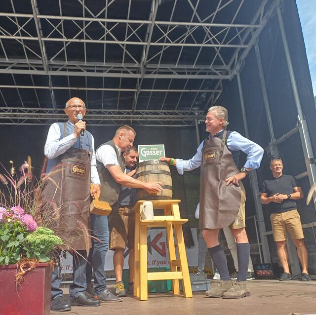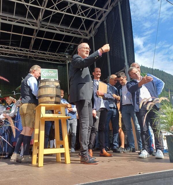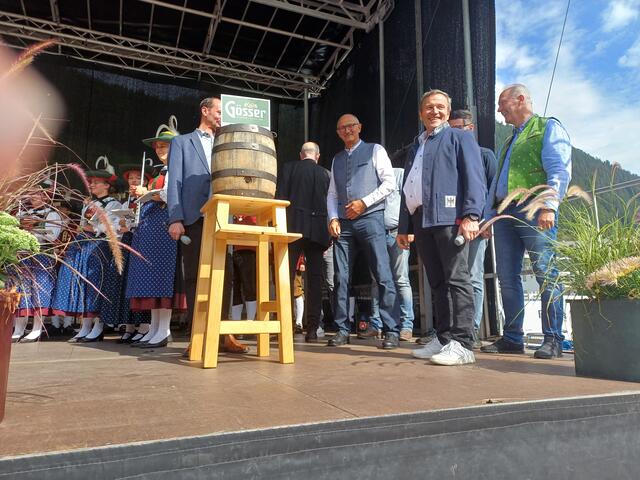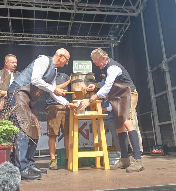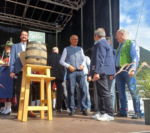 Ein besonderes Highlight war der Besuch von Landeshauptmann Anton Mattle, der trotz seines engen Terminplans zum Festplatz gekommen war. In seinen Grußworten lobte er die Organisation und die Bedeutung des Markttages für die regionale Gemeinschaft. Gemeinsam übernahmen Alexander von der Thannen und Landeshauptmann Toni Mattle den Bieranstich, der auf Anhieb gelang und den Mattle mit „Onzapft ischt“ kommentierte! Begeistert Wirtschaftskammerobmann Michael Gitterle.