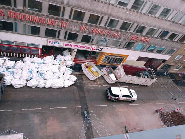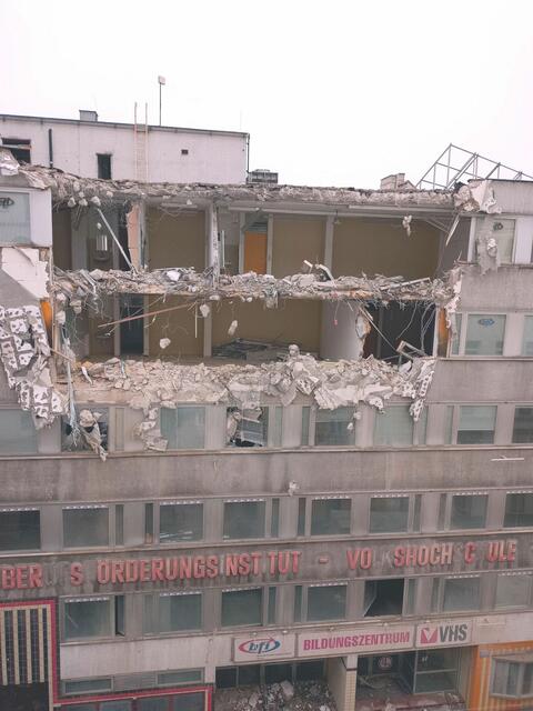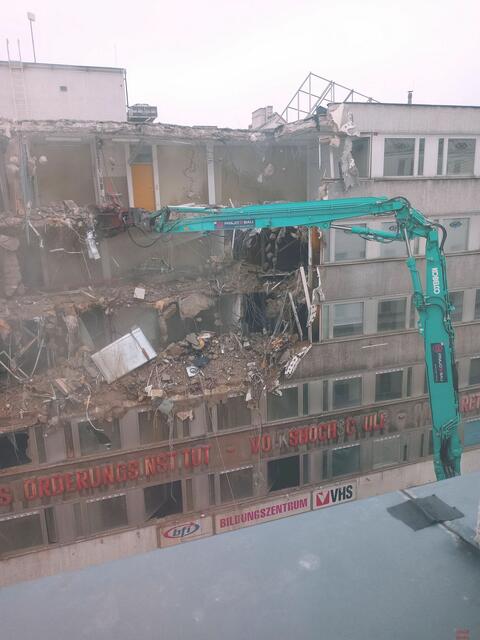 Mitte 2020 wurde dann mit den Abbrucharbeiten begonnen, zuerst das Innere und später auch außen bis Februar 2021 das Haus komplett weg war, seither nur noch die „Aufräumarbeiten“ stattfinden zwecks Recycling der Baustoffe und Vorbereitung des Neubaus, auch wenn offenbar nicht mehr feststeht was statt der VHS entstehen wird.