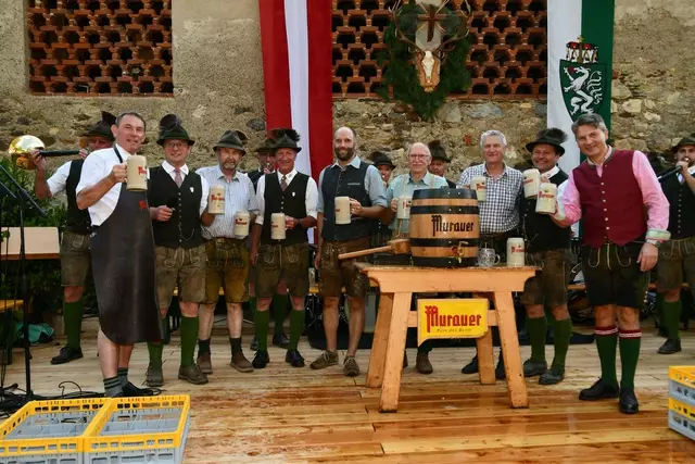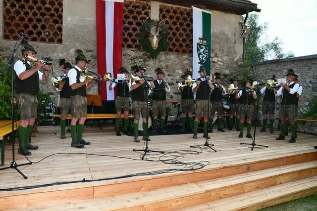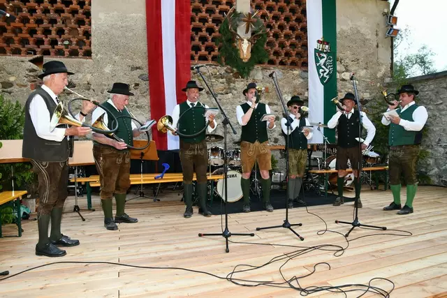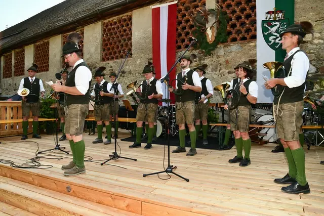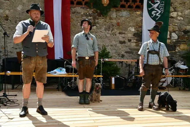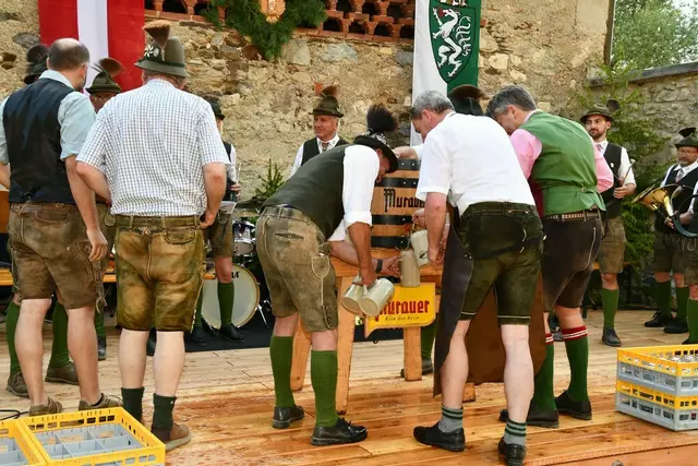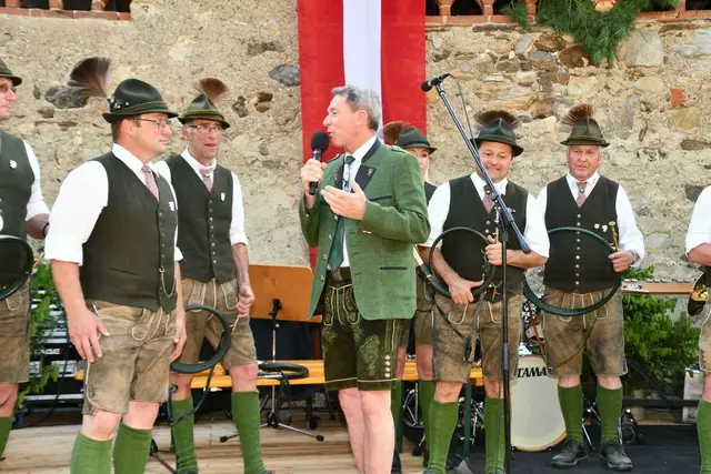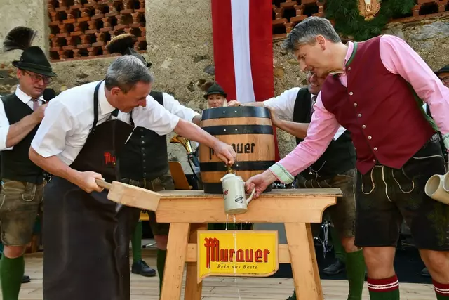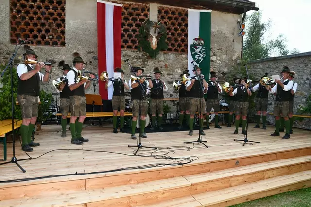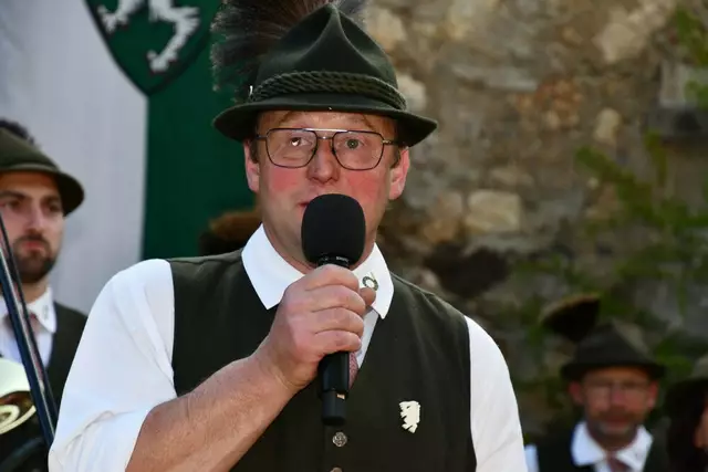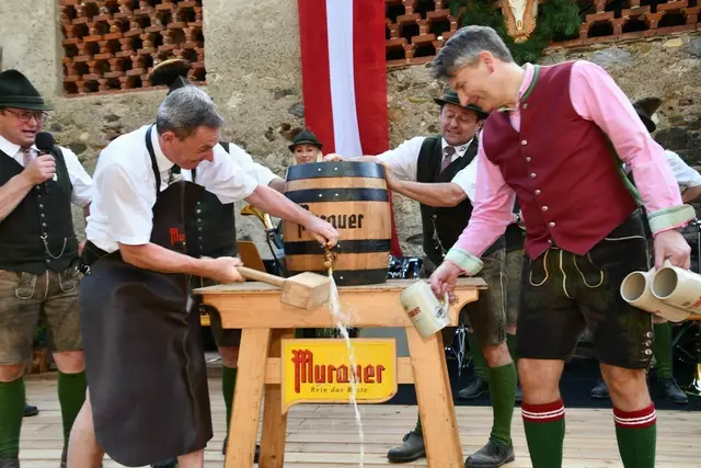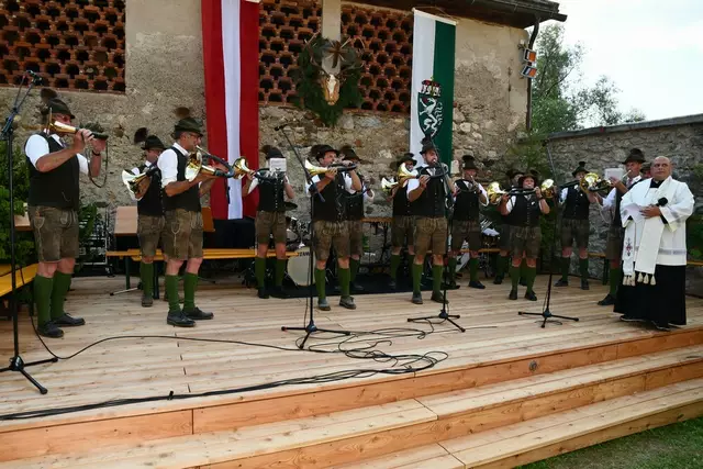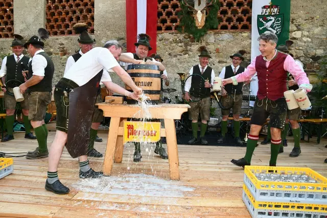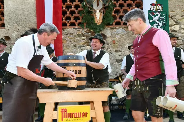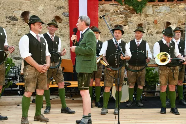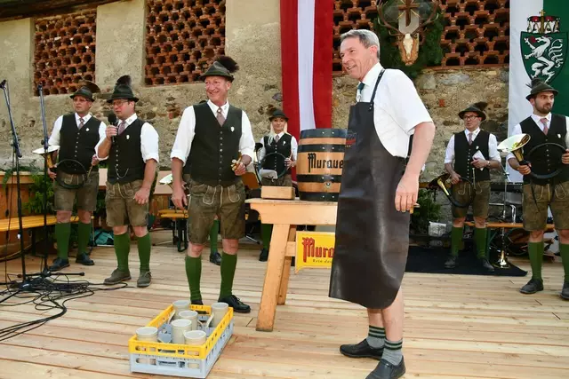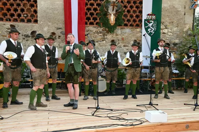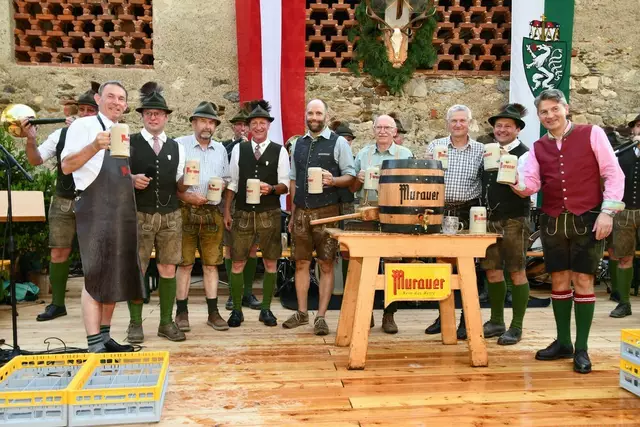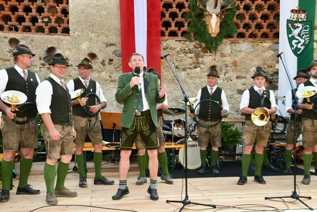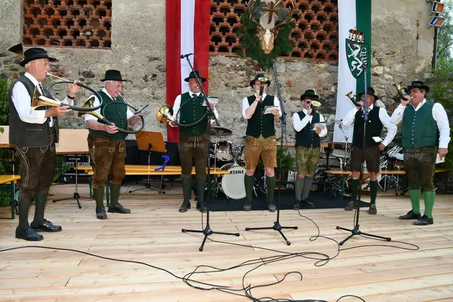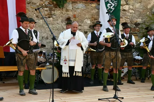 Bgm. Hannes Schmidhofer würdigte in seiner Ansprache die gelebte Tradition und Miteinander der Jagdhornbläsergruppe mit dem Jagdschutzverein und der gesamten Gesellschaft, sie sind ein wesentlicher Teil gelebter Kultur in Oberwölz und darüber hinaus. Vikar Wojciech Zapior erteilte mit einer Andacht den kirchlichen Segen für die großer Feiergemeinschaft. Viel Dank wurden auch der Familie Steiner als Gastgeber im Schlosshof auf Schloss Rothenfels ausgesprochen. Abschließender Höhepunkt der Jubiläumsfeier war Bieranstich mit Bgm. Hannes Schmidhofer und Bgm. Albert Brunner sowie in den Nachtstunden das Sonnwendfeuer auf Schloss Rothenfels.