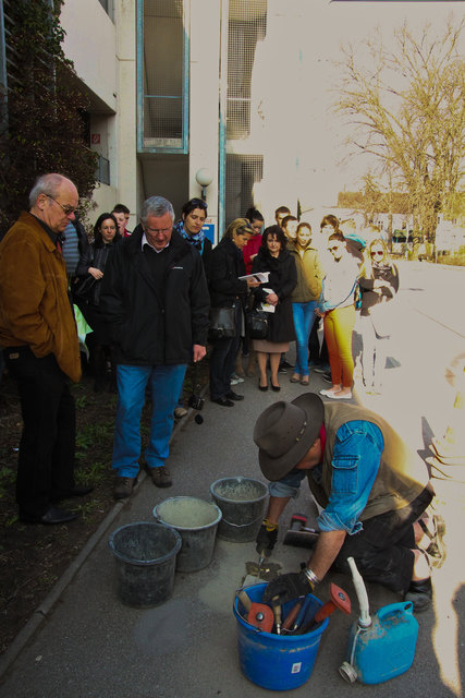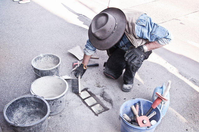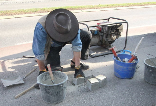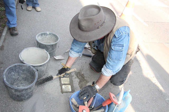 Der Kunstler Gunter Demnig verlegt sogenannte Stolpersteine mit den Daten von Nazi-Opfern, die verschleppt, vertrieben, ermordet wurden.