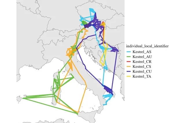 - Die Grafik zeigt die Flugrouten einiger adulter Tiere, die im Jahr 2024 besendert wurden, und heuer wieder zurückgekommen sind. Beispielsweise ist der Turmfalke (Kestrel_CU, dunkelblaue Linie) über Bosnien in Richtung mediterranen Raum und über Italien wieder zurück nach Österreich gekommen.