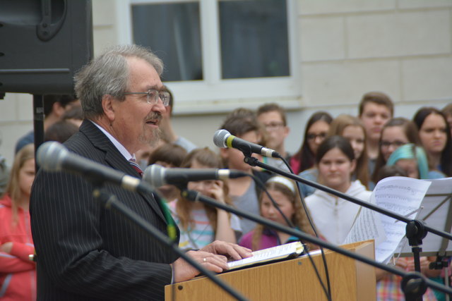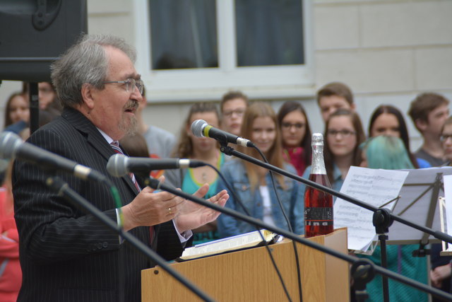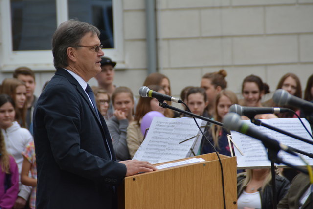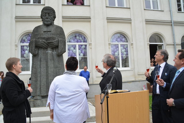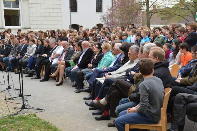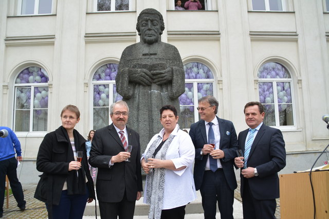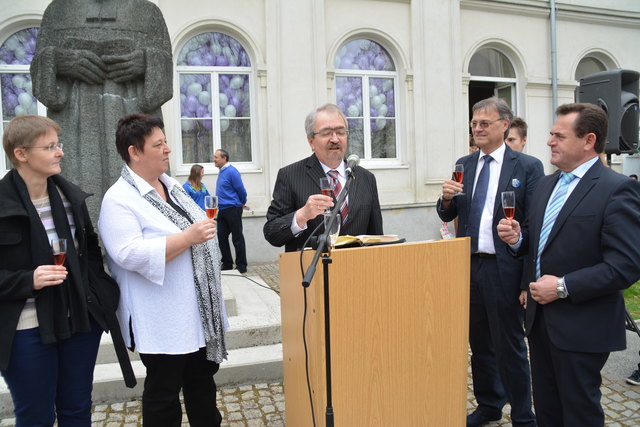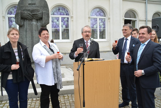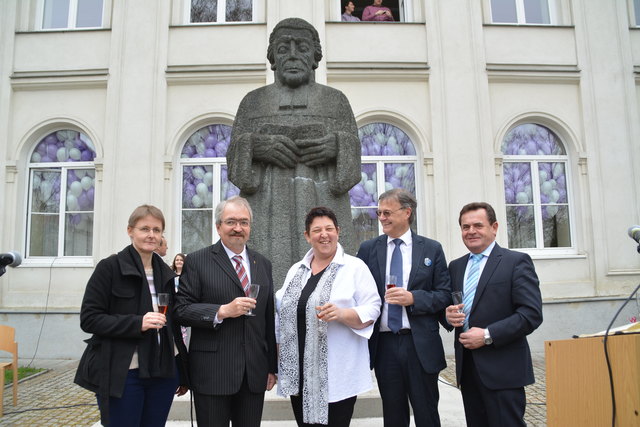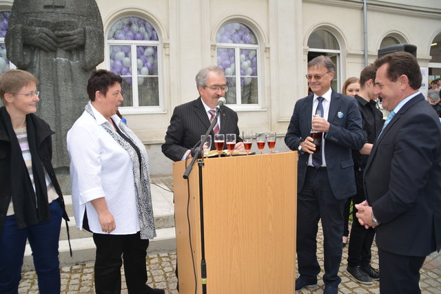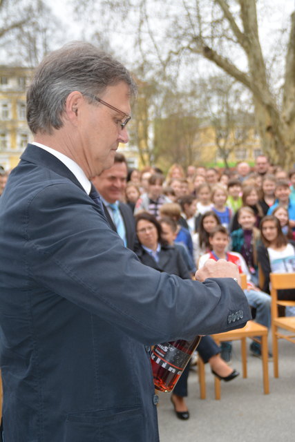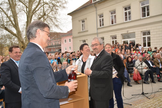 Superintendent Manfred Koch taufte offiziell die Schule mit einem Glaserl Sekt. "Die Statue mit Wasser zu bespritzen macht wenig Sinn und um eine Flasche Sekt wäre es zu schade. Deshalb stoßen wir auf den neuen Namen an", erklärte Koch die etwas ungewöhnliche "Taufe".