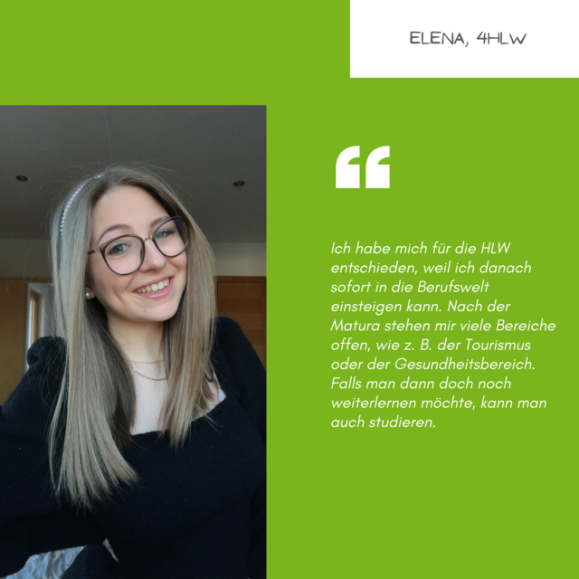 Neben der umfassendsten Allgemeinbildung im beruflichen Schulwesen und einer erweiterten betriebswirtschaftlichen Bildung werden zusätzlich zu Englisch wahlweise Französisch oder Spanisch gelehrt. Spezielles Know-how in Unternehmens- und Dienstleistungsmanagement, fundierte Kenntnisse in Ernährungs- und Restaurantmanagement sowie in der Projektorganisation und Service Design Thinking zeichnen diese Schule für wirtschaftliche Berufe aus. Der Abschluss der Höheren Lehranstalt für wirtschaftliche Berufe (HLW) ermöglicht ein Studium an Universitäten und Hochschulen, auf Grund der kaufmännischen Ausbildung die Gründung eines Unternehmens und den sofortigen Berufseinstieg in viele touristische und kaufmännische Branchen.