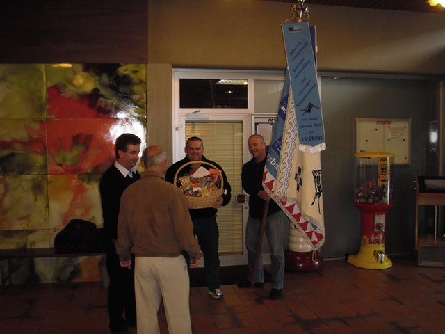Karl wurde vom Präsident ein kleiner Geschenkskorb überreicht. Auch unsere frisch gelieferte neue Vereinsfahne hatte zu diesem Anlass ihr erstes „inoffizielles“ Ausrücken.