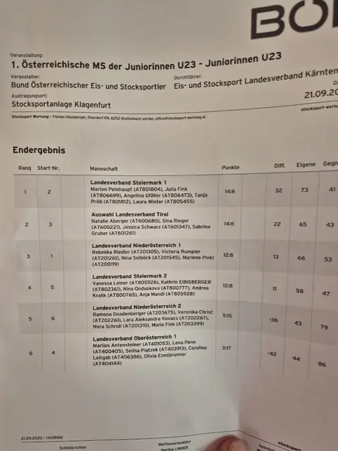 Am Sonntag, den 21. September 2025, fand in Klagenfurt die österreichische Meisterschaft der weiblichen Juniorinnen U23 statt. Unter den sechs teilnehmenden Mannschaften war auch Nina Solböck, eine Spielerin vom ESV Union Ladler Wang, vertreten. Es entwickelte sich ein spannender Kampf um die Podestplätze. Team NÖ 1 mit Nina Solböck lag lange Zeit auf dem vierten Platz, konnte aber im letzten Durchgang durch einen Kantersieg gegen Steiermark 2 noch den dritten Platz erreichen. Damit sind die nationalen Meisterschaften dieser Saison abgeschlossen. Nächstes Wochenende kämpfen die Wanger Herren bei der Champions League erneut in Klagenfurt um ein Spitzenergebnis.Foto: NÖEV