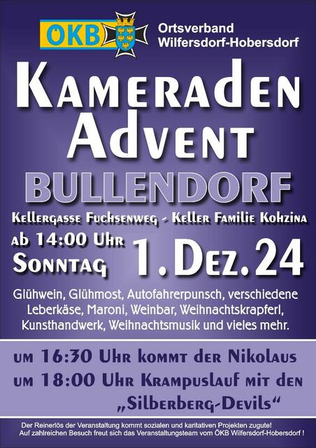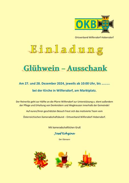 Wilfersdorf:     Am vergangenen Montag und auch am Dienstag haben die Kameraden vom Österreichischen Kameradschaftsbund, Ortsverband Wilfersdorf-Hobersdorf, traditionell zum Punschstand, zum Gedankenaustausch und zur Kameradschaftspflege geladen. Punschhütte vor der Kirche Die Punschhütte war vor der Pfarrkirche von Wilfersdorf aufgestellt. An beiden Tagen wurden die zig Besucherinnen und Besucher sowie Freunde des ÖKB mit Glühwein, Punsch und Kinderpunsch verwöhnt. Zudem gab es Aufstrichbrote...