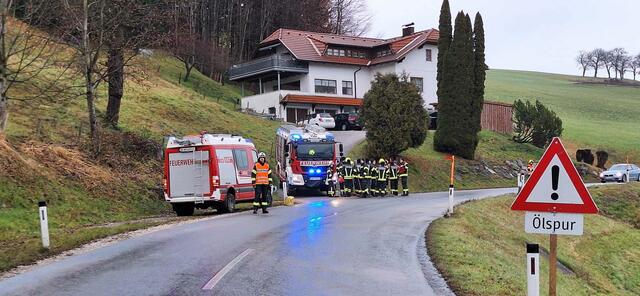 DIETACH. Am Montag, 16. Dezember wurde die Feuerwehr Dietach um 09.34 Uhr neuerlich wegen einer Ölspur alarmiert. Beim Eintreffen an der Einsatzstelle wurde festgestellt, dass im Bereich der Auffahrt von der Harrstraße auf die B 309 in Stadlkirchen eine Ölspur verursacht wurde. Offensichtlich trat in der Kurve über einen undichten Tankdeckel Treibstoff aus und verschmutzte die Fahrbahn. Der Verursacher ist unbekannt. Von den Einsatzkräften wurde Ölbindemittel aufgebracht und der ausgeflossene...