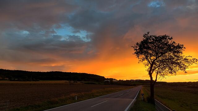 Das ist der Weg ins Ungewisse oder auch zum Sonnenuntergang, der zwischen den Bäumen heraus lacht und den Tag beendet und uns Hoffnung gibt, dass der Neue viel besser und schöner wird, mit Frieden und Liebe