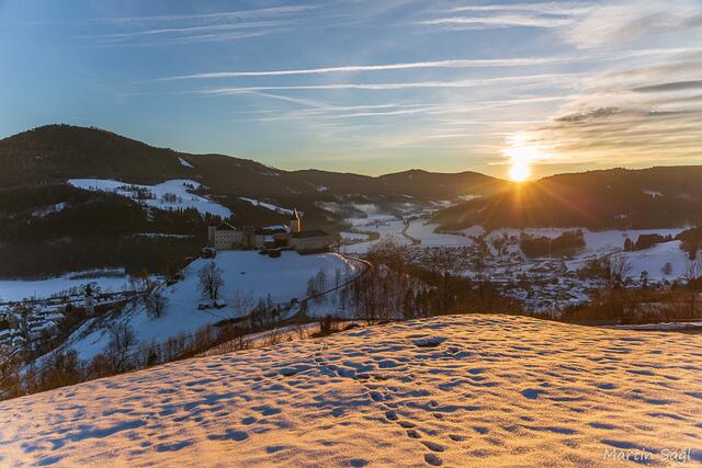 Es zog es mich bei angenehmer Temperatur auf den Freinberg, um den Sonnenuntergang bildlich festzuhalten. Mit einer Thermoskanne mit Kaffee und einer Decke als Sitzunterlage machte ich mich mit einer Freundin auf den Weg zu der  Bank an der Felswand. Die Aussicht war herrlich, die Gebirgskette klar zu sehen und der farbenfrohe Himmel beeindruckend. Mal einen Schluck vom warmen Getränk, mal einen Druck auf den Auslöser, die Zeit verging sehr schnell bis die Sonne hinter den Bergen an der Grenze...