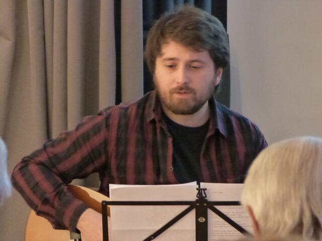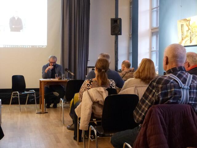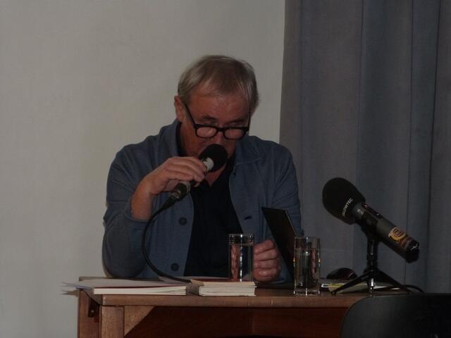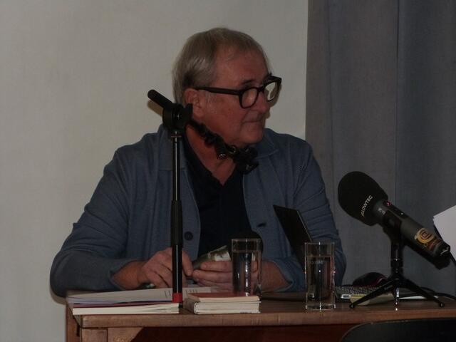 Autor Rudolf Karazman im Gespräch mit dem Publikum, musikalisch begleitet von Stefano Blascetta – eine eindrucksvolle Verbindung von nachdenklichen Worten und stimmungsvollen Klängen.