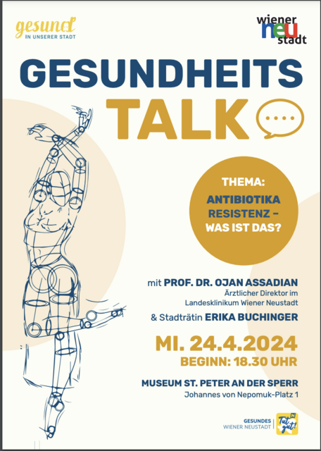 WIENER NEUSTADT(Red.). Das Thema "Antibiotika Resistenz - was ist das?" steht beim nächsten Gesundheitstalk von Gesundheitsstadträtin Erika Buchinger im Vordergrund. Der Ärztliche Direktor im Landesklinikum Wiener Neustadt Prof. Dr. Ojan Assadian wird am Mittwoch, dem 24. April, um 18.30 Uhr im Museum St. Peter an der Sperr darüber referieren.
