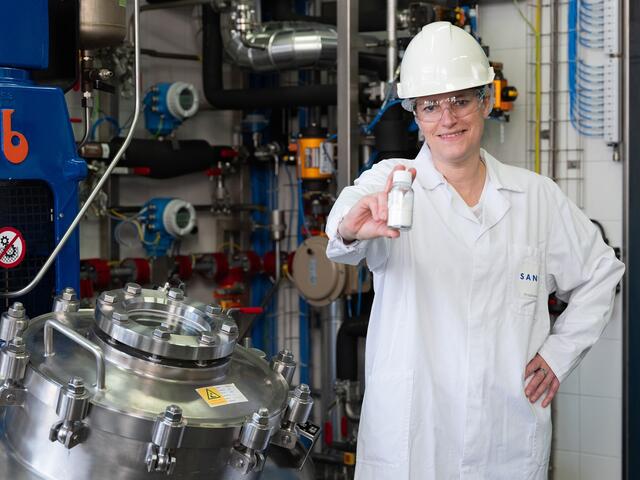 Werksleiterin Stephanie Jedner zeigt den neuem Wirkstoff. | Foto: Sandoz /Vandory