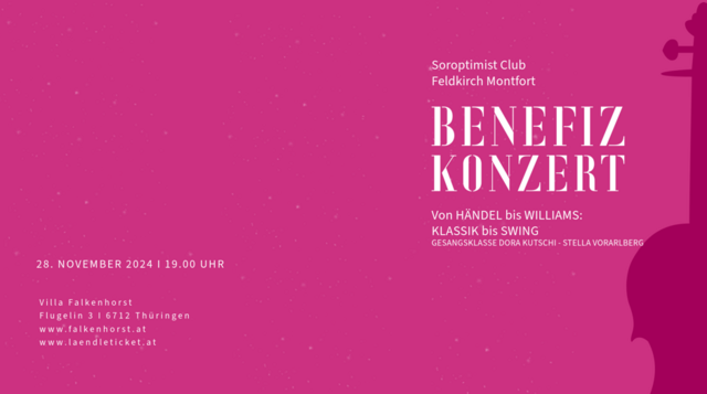 Der Soroptimist International Club Feldkirch Montfort lädt zu einem Benefizkonzert zur Adventszeit am 28. November 2024 in der Villa Falkenhorst. Talentierte junge Studierende der Gesangsklasse Dora Kutschi (Stella Vorarlberg Privathochschule für Musik) präsentieren zusammen mit Clemens Müller am Klavier ein abwechslungsreiches Programm zwischen Klassik und Swing. Zum Abschluss des Abends laden die Damen des Clubs zu Aperitif und hausgemachten Häppchen. Nähere Informationen entnehmen Sie bitte...