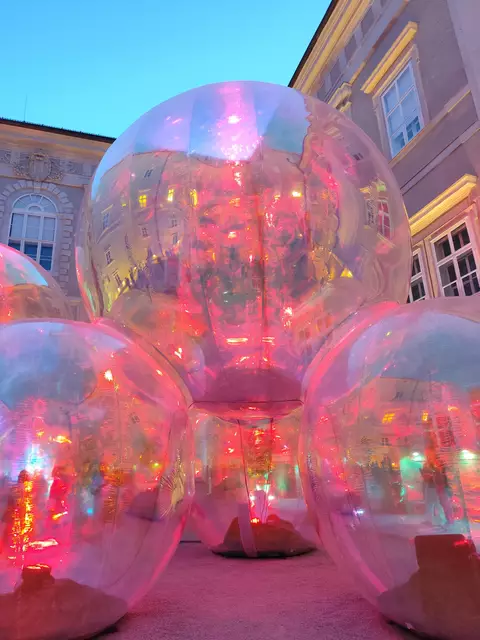 Nach 3 Wochen krankheitsbedingt fast nur zu Hause, habe ich mich auf einen kleinen Ausflug in die Stadt sehr gefreut. Die Kunst-Installation von Atelier SISU im Domquartier ist total gelungen. So schön und faszinierend können einfache, mit Luft gefüllte Plastikbälle sein. Bei Nacht traumhaft beleuchtet ist der Anblick Balsam für die Seele!