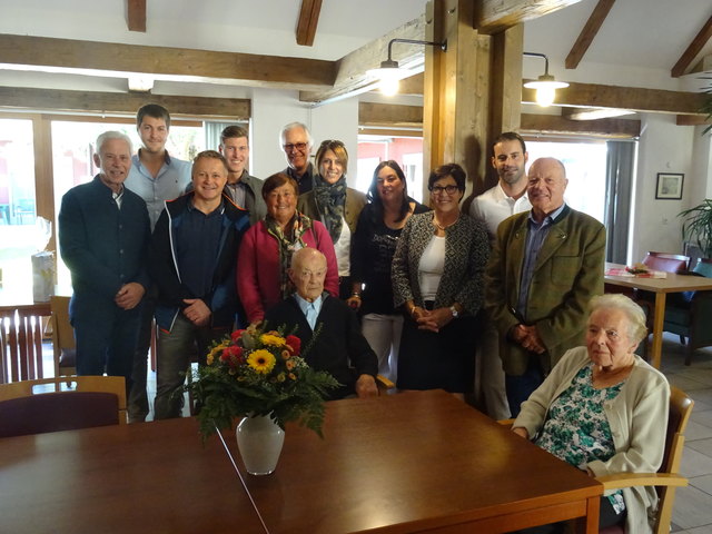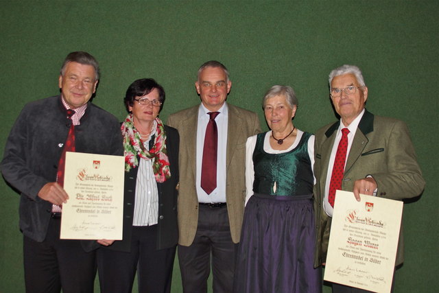 v.l.n.r.: Vizebürgermeister Herbert Siebenhofer, Obmann Norbert Stolz, Maria Stolz, der geehrte Josef Stolz, Bürgermeister Gerhard Stolz und Kapellmeister Johannes Lintschinger. | Foto: Musikverein "Alpenklänge" Krakauebene
