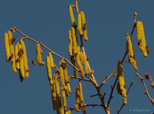 Erstes Frühlingsahnen Haselbüsche tragen Blüten zart und fein laden Bienen mit ihren Kätzchen ein um daran zu naschen wo sonst alles rar bieten sie hier Pollen reichlich dar. Trägt der Wind mit sich die Pollen fort oft auch noch weit an and'ren Ort sind die goldnen Kätzchen weit zu sehn wie sie leuchtend in der Sonne stehn. Summt es an diesen warmen Tagen laut Bienen am Busch wo man nur schaut zartes erstes Frühlingsahnen lebet auf bald nimmt Frühling wieder seinen Lauf..... (© Helga Amh)...