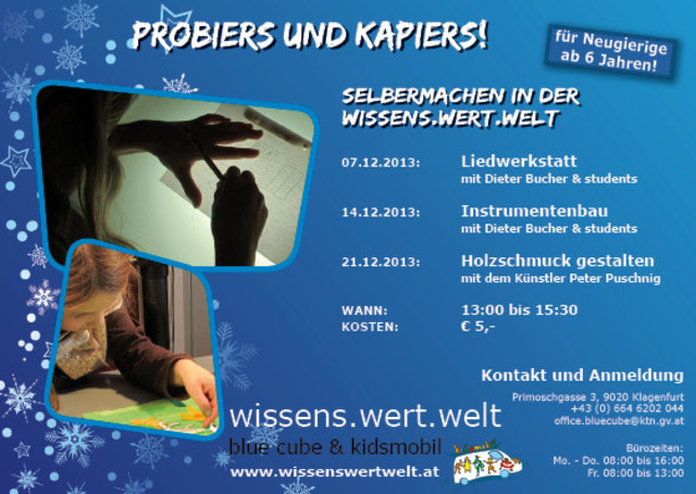 Wenn an den Einkaufssamstagen in den Straßen und Einkaufszentren reges Treiben herrscht, verwandelt sich das Cafe – Bistro beim Kulturhügel in Maria Gugging zu einer gemütlichen Bastel- und Backstube. Während Eltern ihre Weihnachtseinkäufe erledigen oder sich eine kurze Auszeit am Nachmittag nehmen möchten können ihre Kinder einen fröhlichen Nachmittag mit vielen Aktivitäten erleben. Martina, eine erfahrene Weihnachtselfe, wird mit den Kindern den ersten Teil des Nachmittages gestalten. Die...
