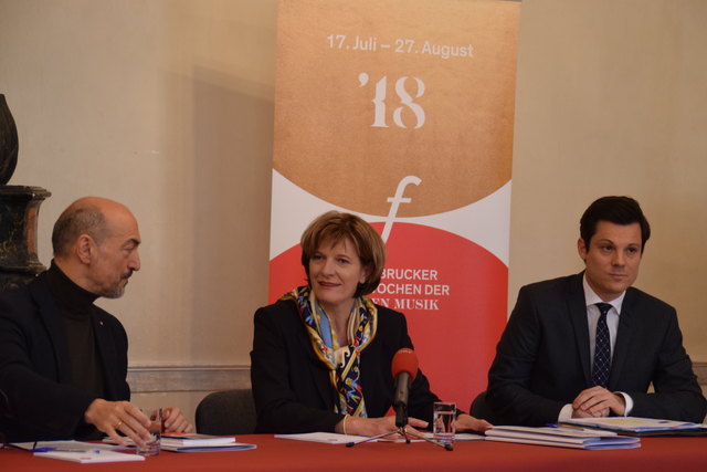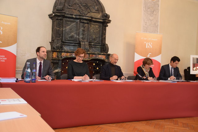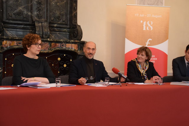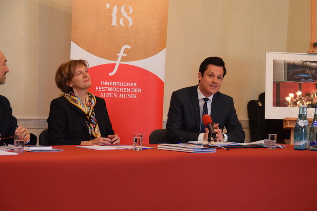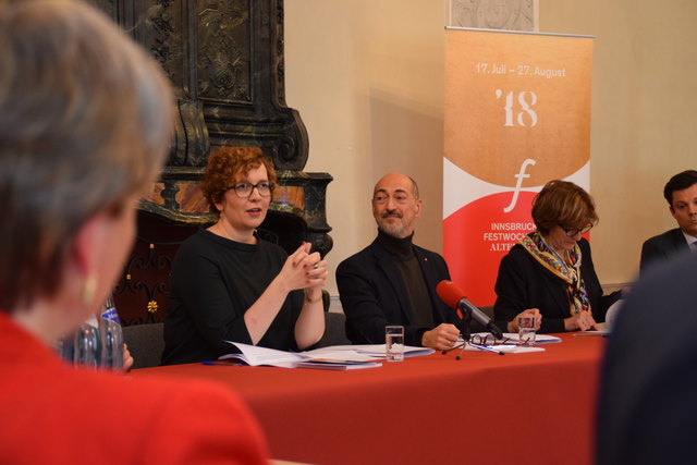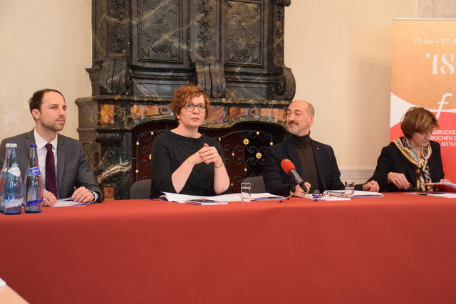 Bewegte Welten bei den Innsbrucker Festwochen 2018: (v.l.) Betriebsdirektorin Eva-Maria Sens, Intendant Alessandro De Marchi, Bürgermeisterin Christine Oppitz-Plörer, Geschäftsführer Markus Lutz