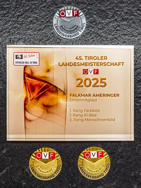 Ich freue mich sehr über den Tiroler Landesmeistertitel 2025 in der Fotografie. Kategorie Farbbild -  1. Platz Kategorie Generierte Bilder KI -  1. Platz und in der Kategorie Monochrombild erreichte ich den 2. Platz. Vielen Dank an den Fotoklub Hall in Tirol, welcher die Siegerehrung und Preisverleihung in der Burg Hasegg ausgerichtet hat. Es war ein sehr schöner Abend, in einem stimmungsvollen Rahmen.