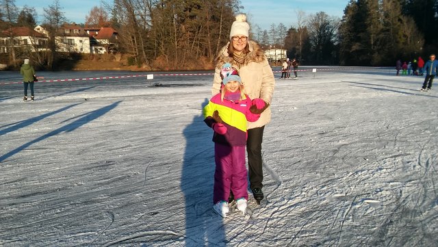 Der Moosburger Teich wurde vor kurzem von der Gemeinde für Eislaufen freigegeben. Viele finden großes gefallen an dieser tollen Sportart, und verbringen mit der Familie viele Stunden auf dem Eis. Auch wir fahren 2-3 mal pro Woche zum zugefrorenen Teich, denn Claudia und ihre Freundinnen genießen die Sonne und den vereisten, kleinen See!