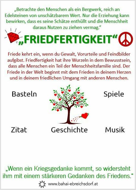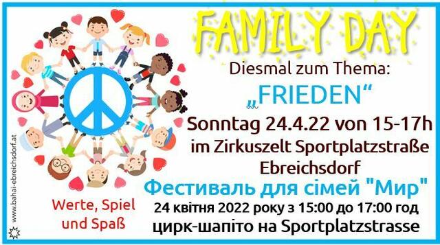 In regelmäßigen Abständen initiiert die Baha'i Gemeinde "Family Days", jeweils zu einer anderen Tugend, wie zum Beispiel Geduld, Zusammenarbeit, Respekt, Mut oder Liebe. Unter dem Motto "Werte, Spiel und Spaß" können Familien die" Herzensbildung", wöchentliche Kindergruppen, kennenlernen. Ende April fand, in der außergewöhnliche Atmosphäre eines Zirkuszeltes, das wetterbedingt gemietet wurde, der Family Day in Ebreichsdorf statt. Diesmal zum aktuellen Thema "Frieden". Während die Kinder mit...